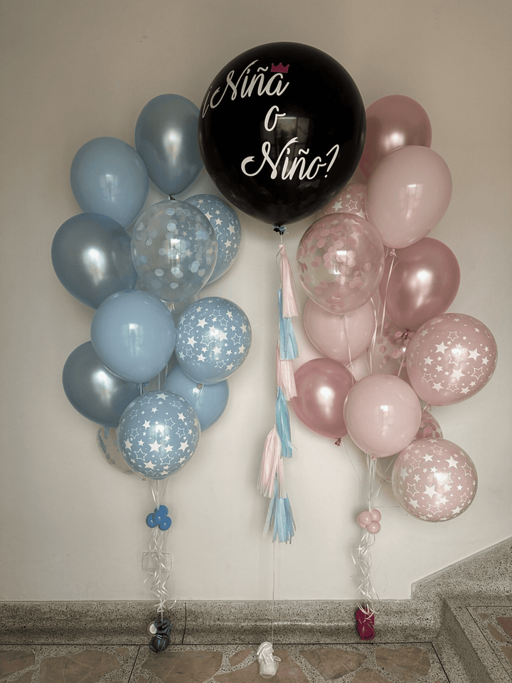 Globo Grande personalizado ( lleva por dentro el confeti del color del sexo del bebé) dos ramilletes de globos cada uno con 12 globos, en este caso puedes elegir los colores y el mensaje